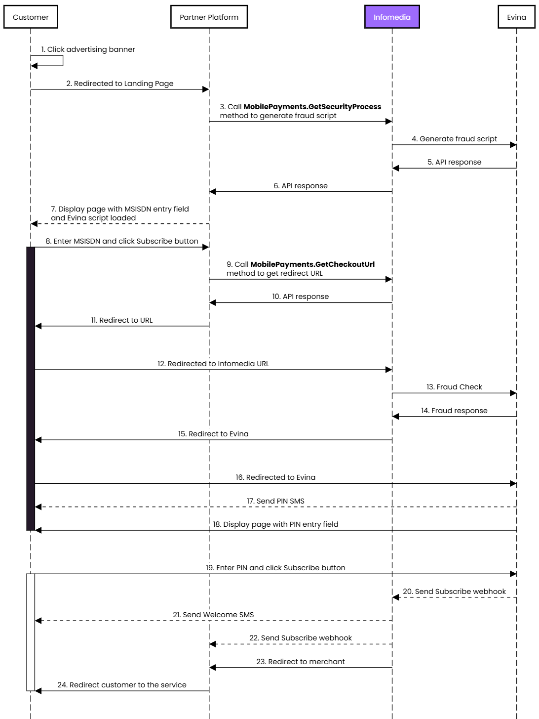 POST https://api.infomedia.co.uk/dcb/GetCheckoutUrlContent-Type: application/jsonX-Infomedia-Api-Key: {Your API Key}{"params": [{"key": "pid","value": "92000000"},{"key": "subid","value": "8000000"},{"key": "mx","value": "971500000000"},{"key": "mcc","value": "424"},{